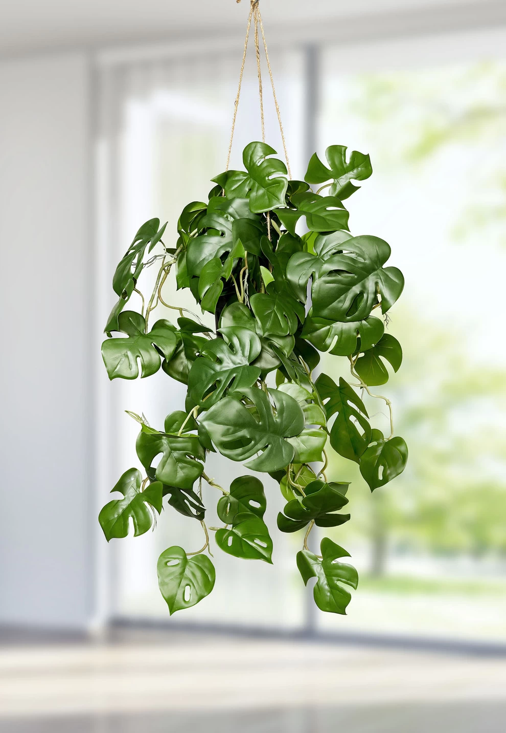 Diese naturgetreue Splitphilo-Ranke wurde fest in einen schwarzen Kunststofftopf eingesetzt. Mit praktischer Aufhängung aus Sisal. Aus hochwertigem Kunst- und Textilmaterial hergestellt.
