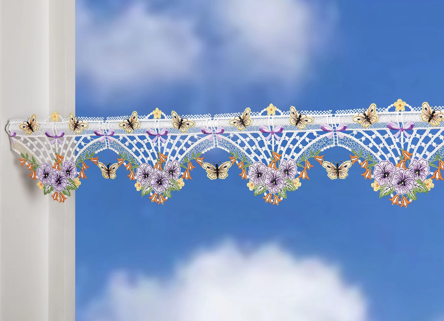 Fantastischer Fensterschmuck nicht nur zur Osterzeit: Farbenfrohe Stangendeko aus echter Plauener Spitze. Die Qualität: 100% Polyester