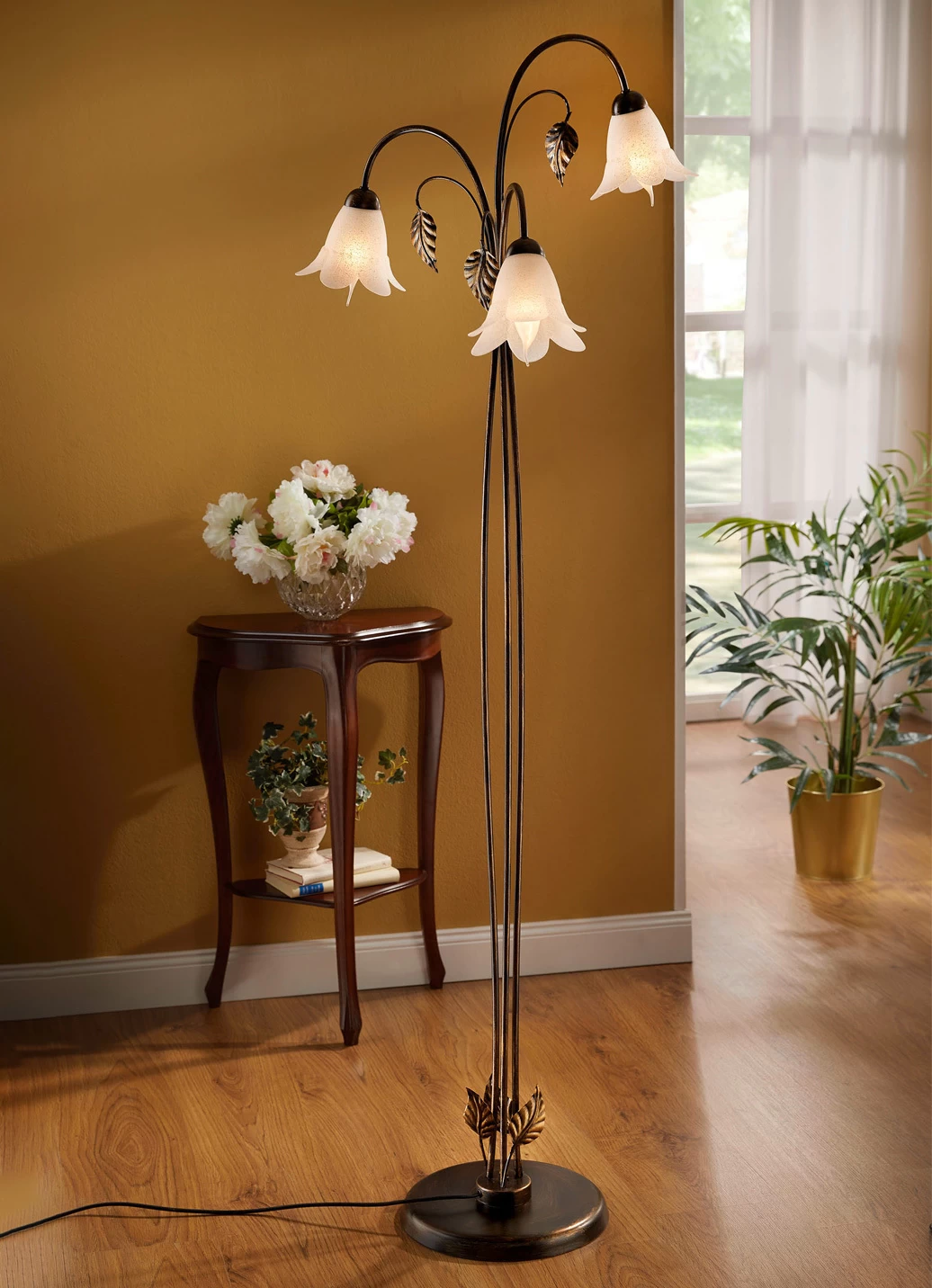 Klassisch schöne und detailverliebt verarbeitete Leuchten aus braun-schwarz-goldfarbenem Metall mit dekorativem Blattwerk und satinierten, blütenförmigen Glasschirmen gefertigt. Sie spenden stimmungsvolles Licht auch in den dunkelsten Räumen. Jeweils 230 Volt. Die Lieferung erfolgt ohne Leuchtmittel. Mit Aufbau-Anleitung