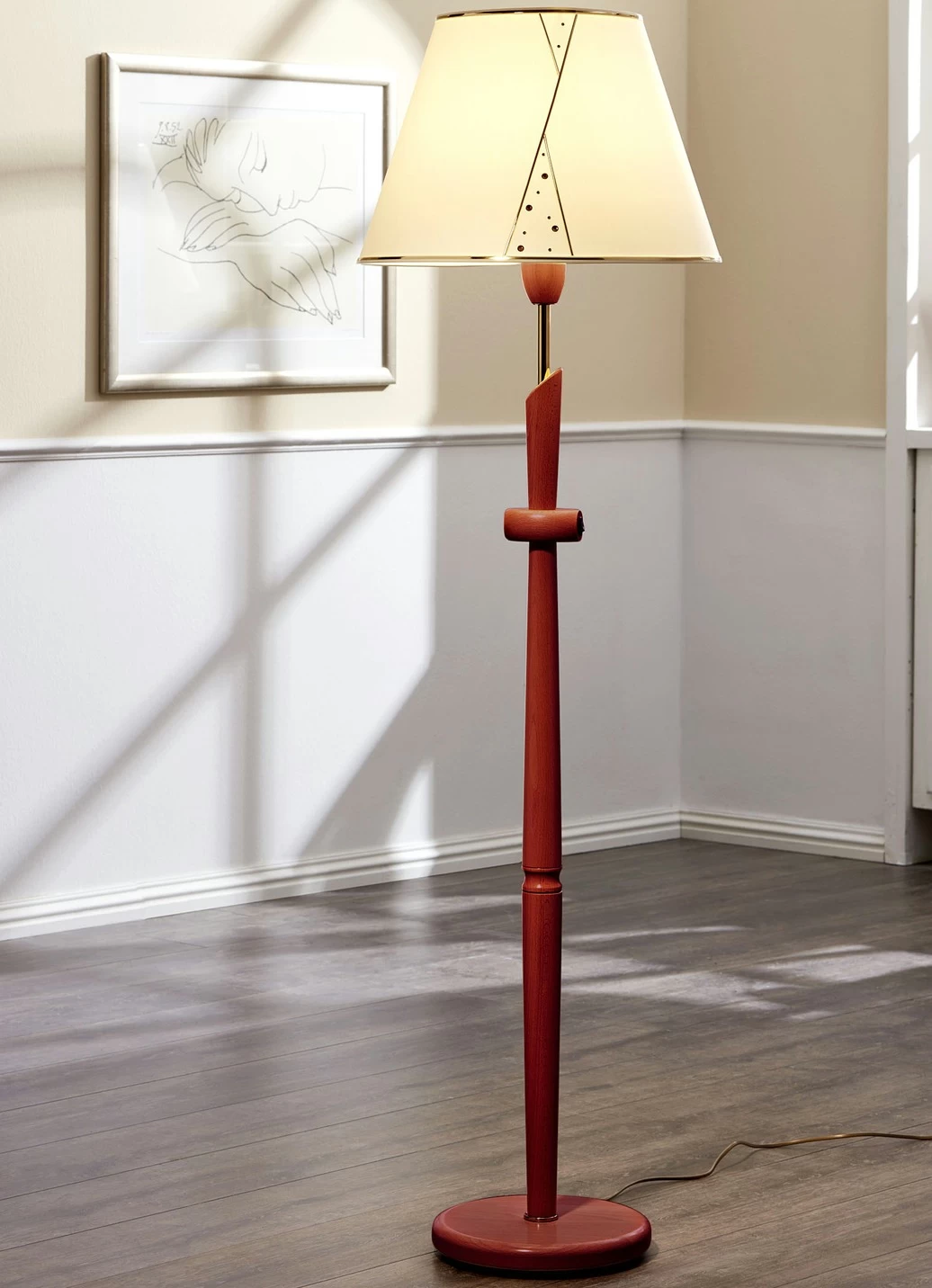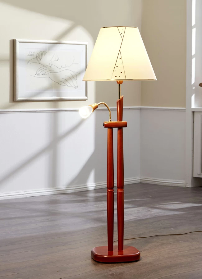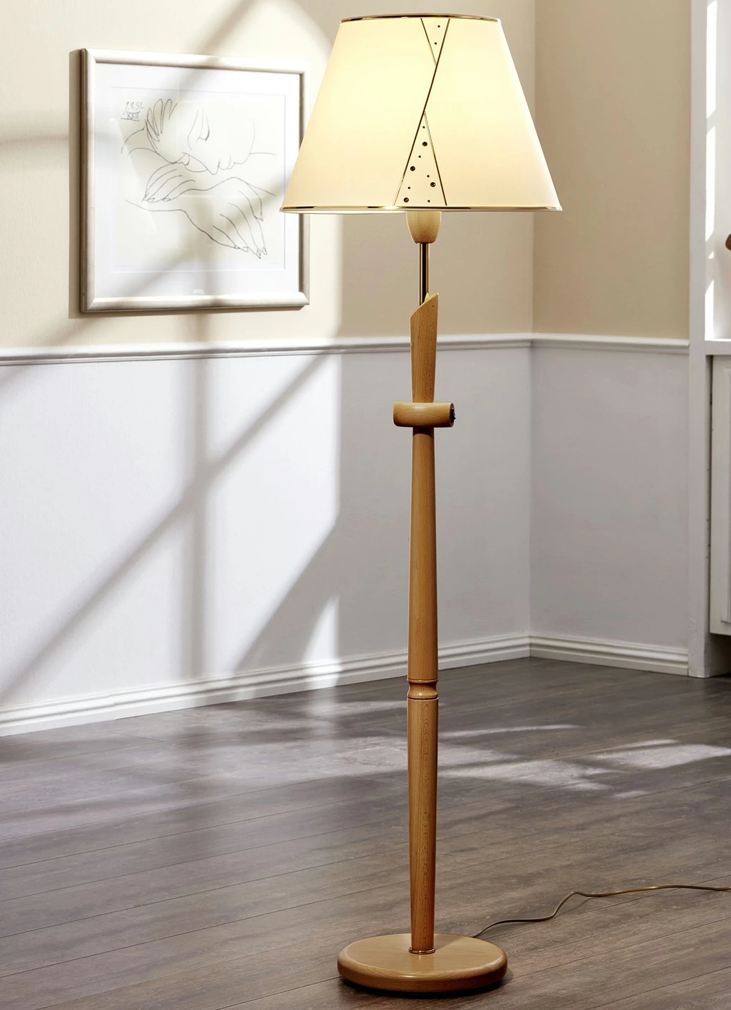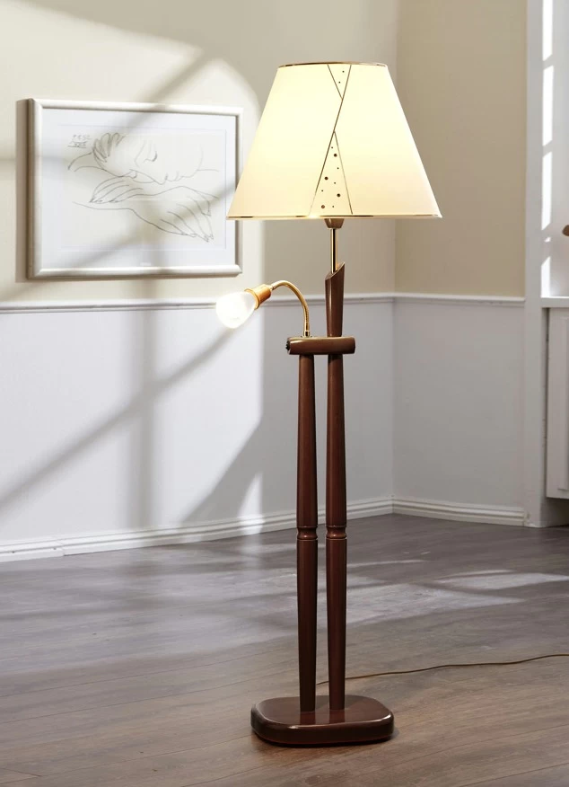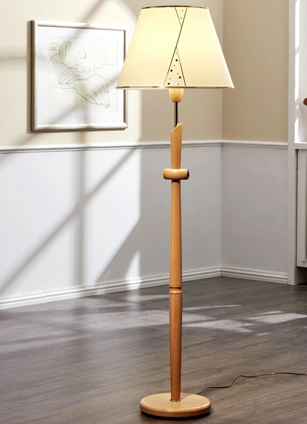Stehleuchte mit Stoffschirm in der Ausführung Stehleuchte und in Eiche.