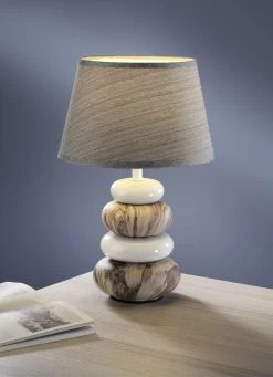 Mit ihrem schlichten Design überzeugt diese attraktive und stilvolle Tischlampe aus altmessingfarbenem Metall. Mit Stoff-Lampenschirm und Kunststoffsteinen in Kristalloptik. Jeweils 230 Volt. Die Lieferung erfolgt ohne Leuchtmittel. Mit Aufbau-Anleitung