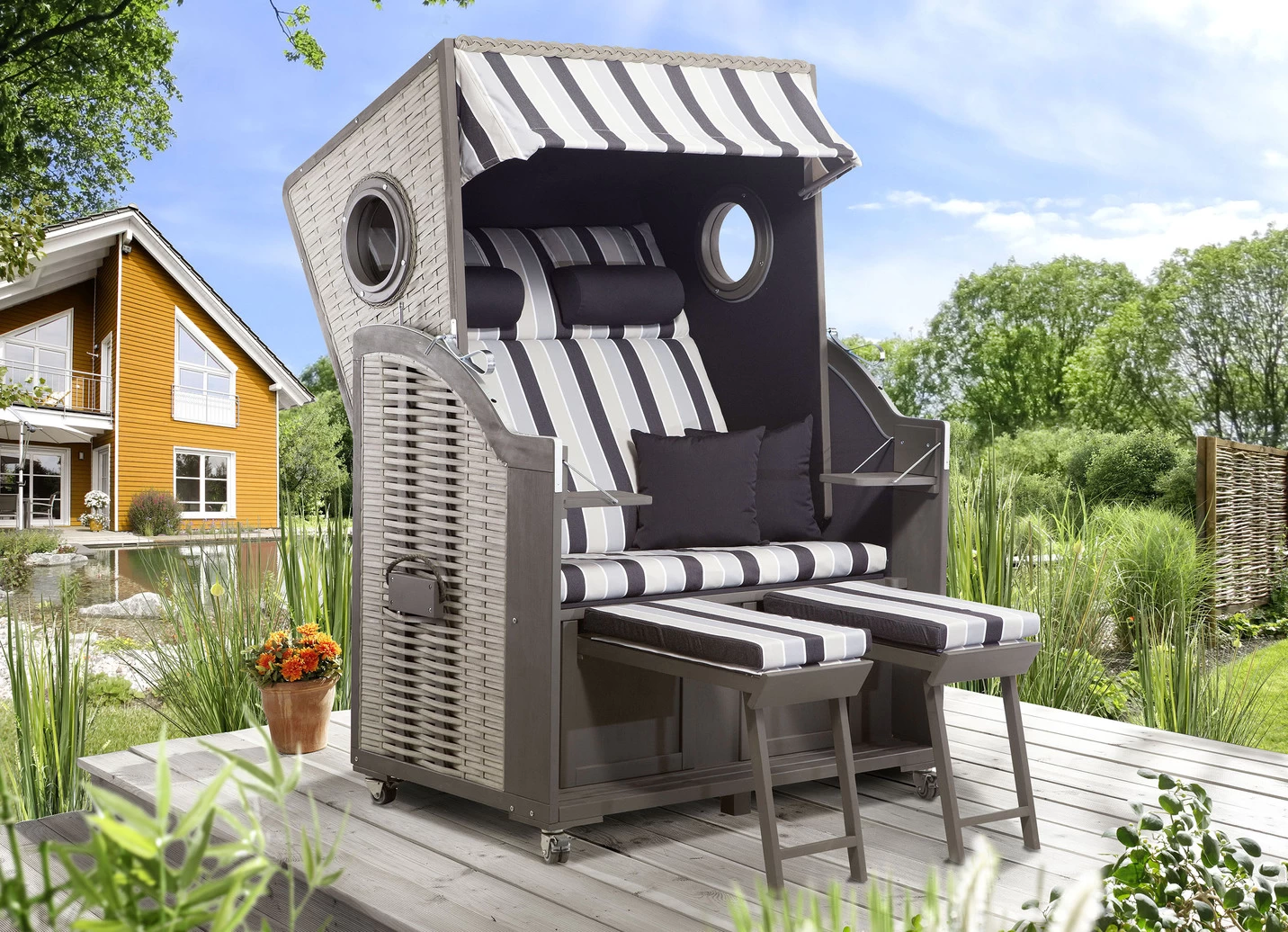 Oberkorb mit 2 Sichtfenstern/Bullauge. Mit zwei ausklappbaren Bistrotischen, zwei Wurf- und zwei Nackenkissen, sowie zwei ausziehbaren, gepolsterten Fußstützen. Herausnehmbare Polster aus hautsympatischen und wetterfesten Kunstfasern (100% PES), Gestell aus witterungsbeständigem Fichtenholz. Besonders edle Verarbeitung mit hochwertigem Geflecht aus 14 mm Flachband aus Recyclingmaterial. Inklusive optional montierbaren Transportrollen mit Feststellbremse.