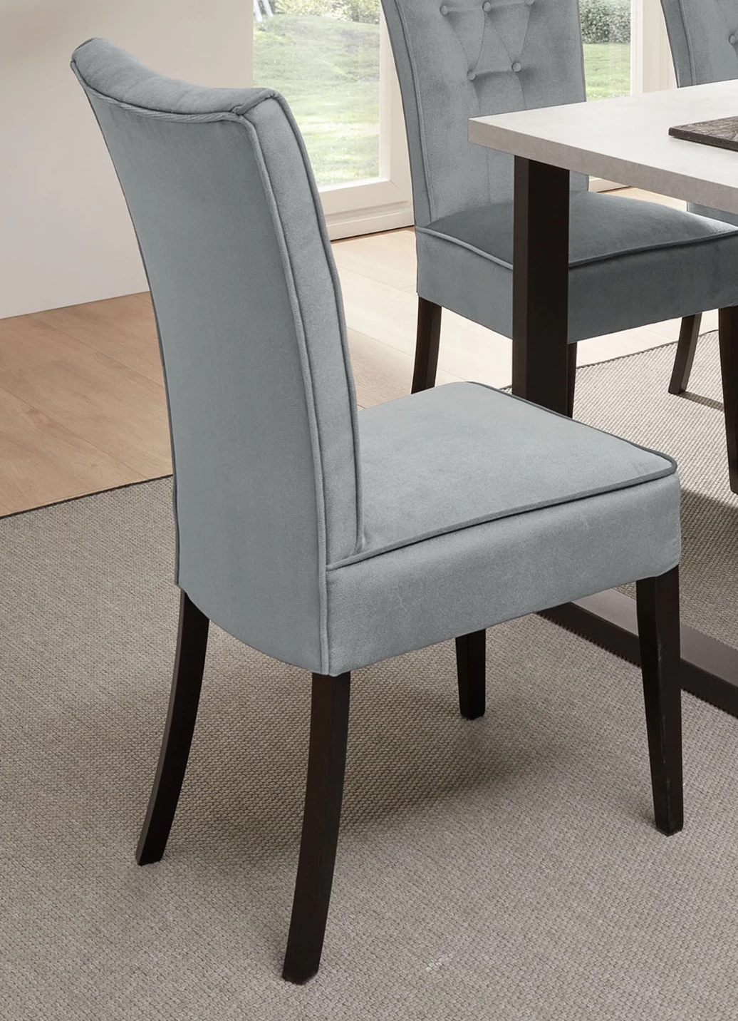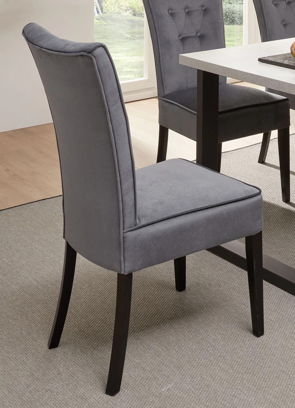 Diese Stühle gefallen mit ihrem eleganten Charme. Die Stühle aus massivem Buchenholz mit hohen Rückenlehnen sind bequem gepolstert. Bezüge (100% Polyester) mit schöner Knopfsteppung an den Rückenlehnen und schwarzen Stuhlbeinen.