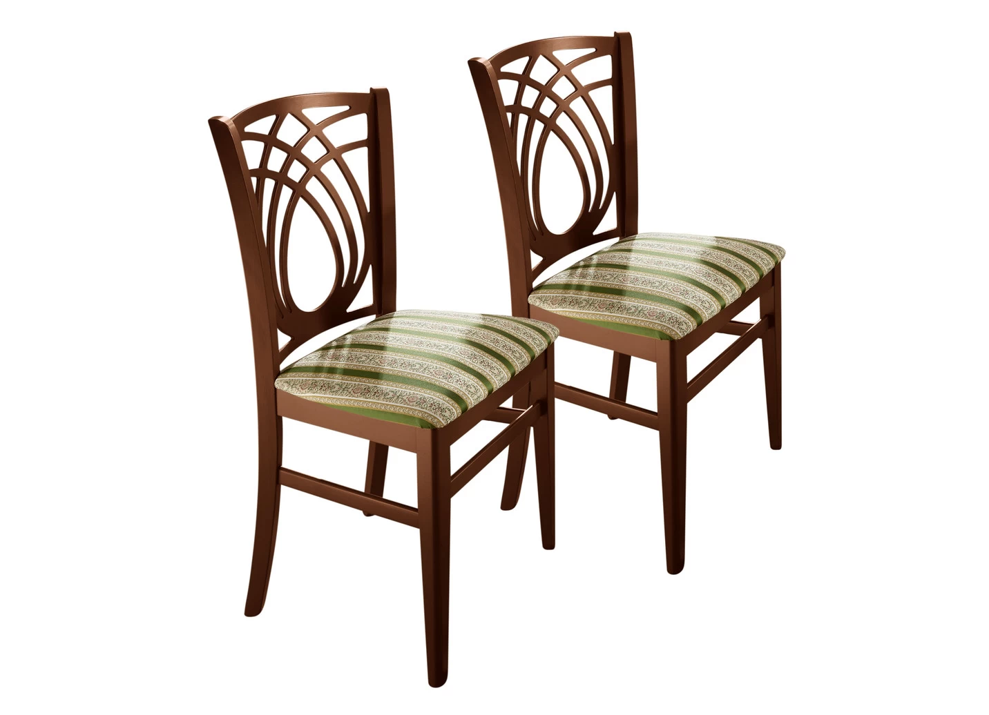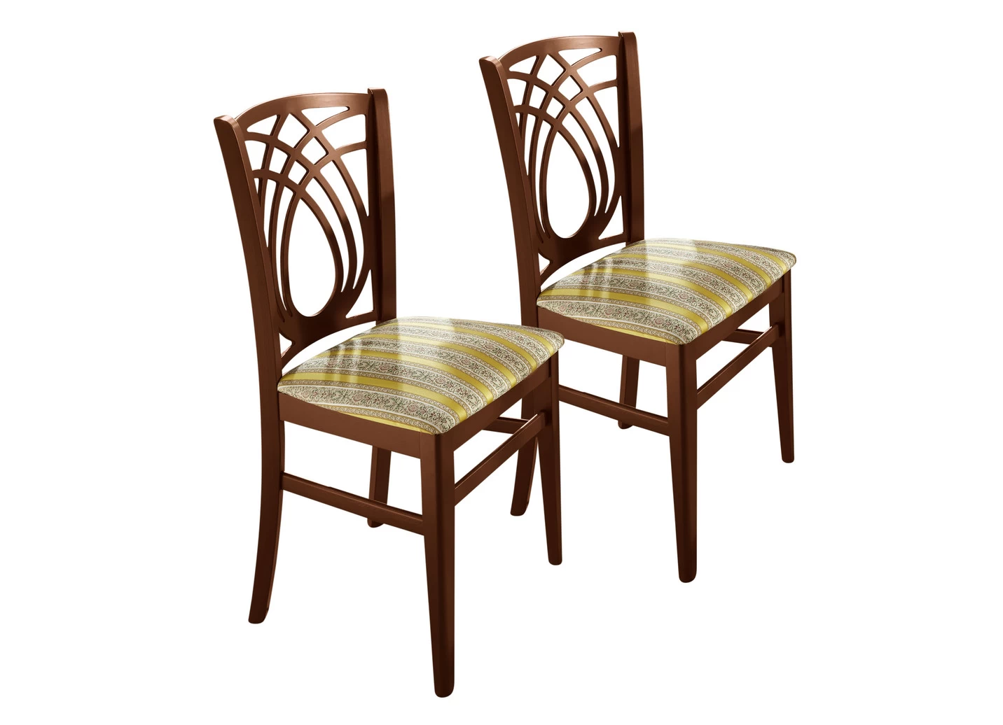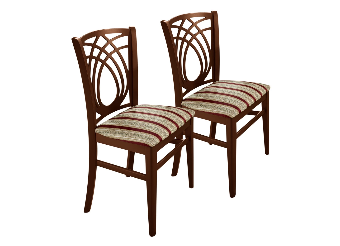 Von ausgesprochener Schönheit! 2er-Set Stühle aus massiver Buche, jeweils in Nussbaumfarben. Mit gestreiftem Bezug aus 50% Viskose und 50% Polyester. Die Stühle werden aufgebaut geliefert