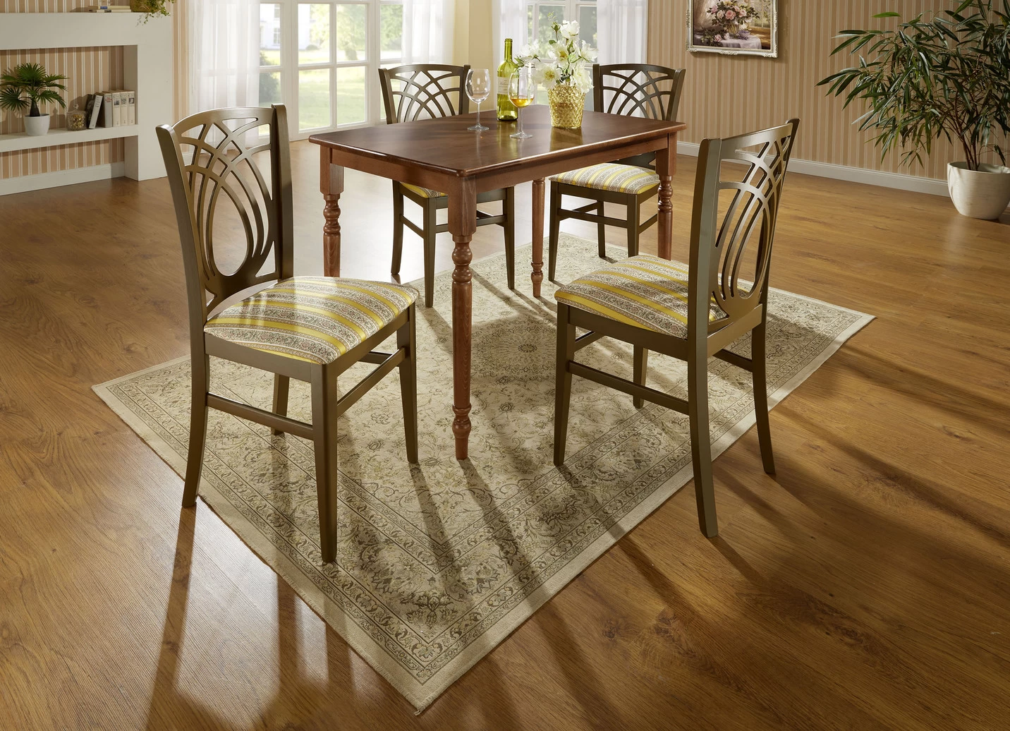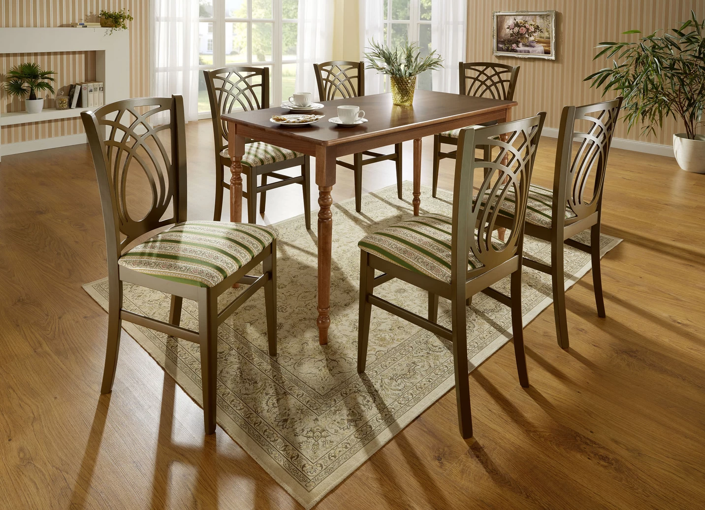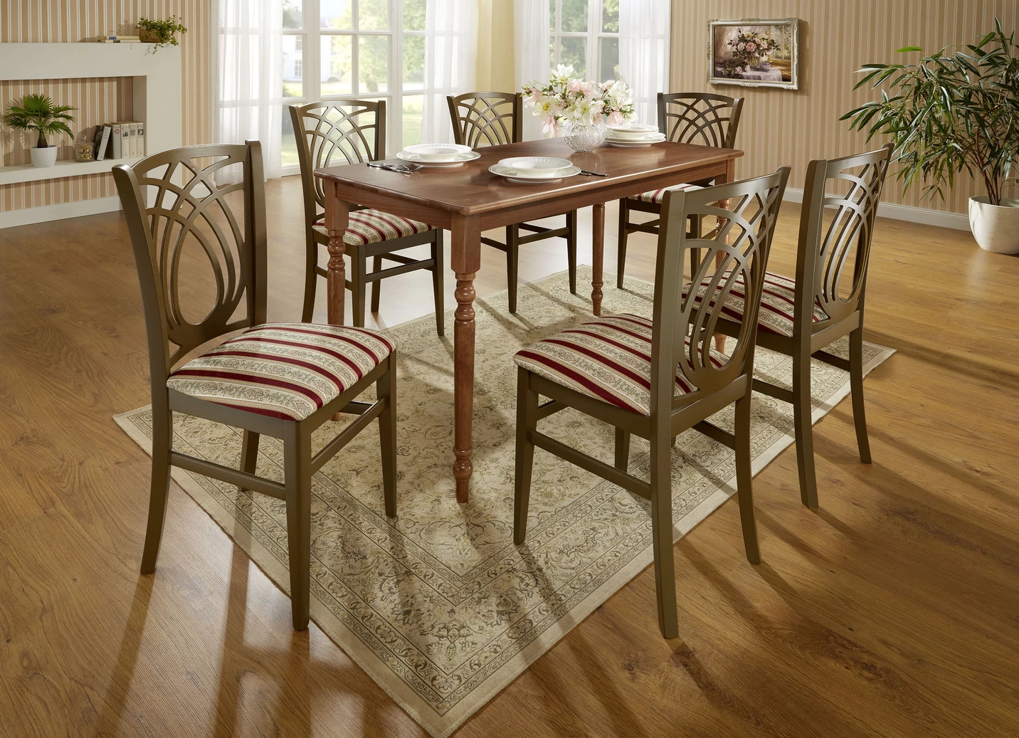 Von ausgesprochener Schönheit! 2er-Set Stühle aus massiver Buche, jeweils in Nussbaumfarben. Mit gestreiftem Bezug aus 50% Viskose und 50% Polyester. Die Stühle werden aufgebaut geliefert