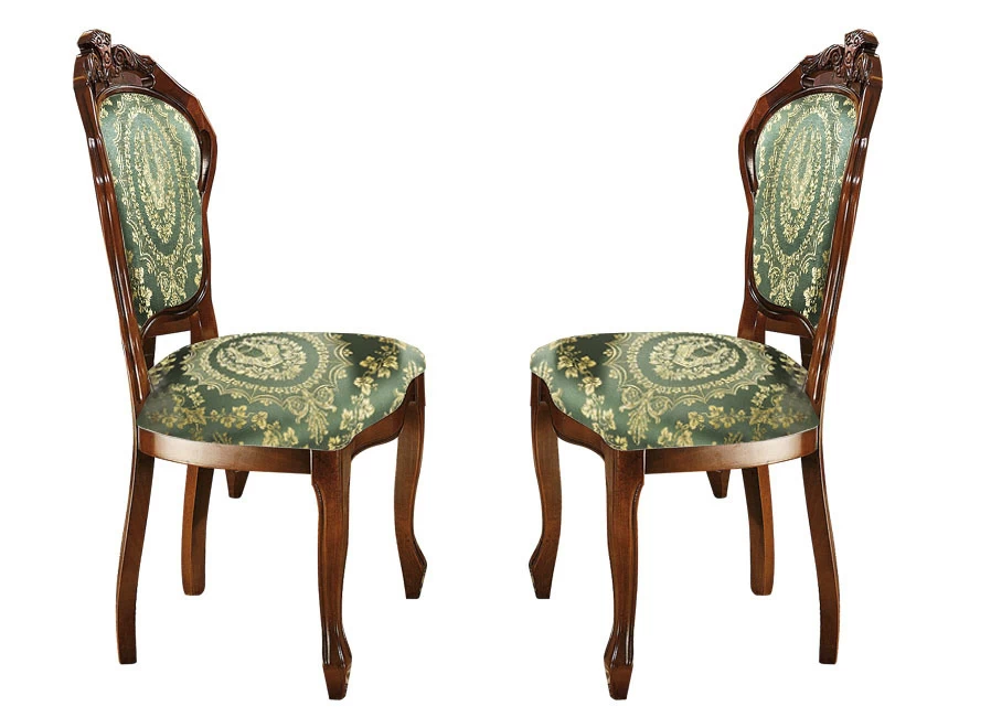 Prächtige Stühle und Armlehnenstühle mit aufwendigen Schnitzereien am massiven nussbaumfarbenen Buchenholzgestell. Sitzflächen mit Federkern, Armlehnenstühle mit gepolsterten Armlehnen. Bezug: 51% Acetat, 49% Polyacryl; Sitzhöhe 49 cm
