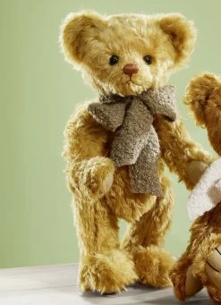 Diese beiden bezaubernden Teddybären lassen nicht nur Sammler-Herzen höherschlagen. Sie wurden im Hause „Clemens Spieltiere“ aus hochwertigem Mohairplüsch hergestellt und mit einer farblich passenden Schleife aus Boucle ausgestatttet. 5-fach gegliedert und mit gestickter Nase gearbeitet. Handund Fußplatten aus Filz gefertigt. Limitierte Auflage von je 233 Stück, mit Limitierungspass und Clemens Markenzeichen.Maße: Höhe 40 cm.