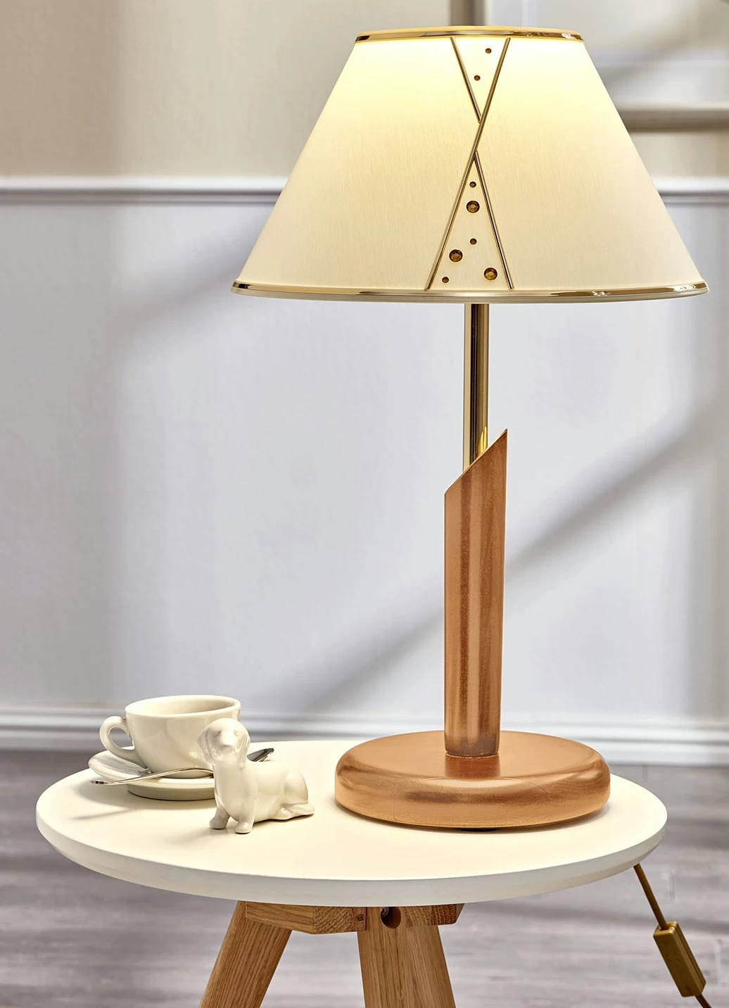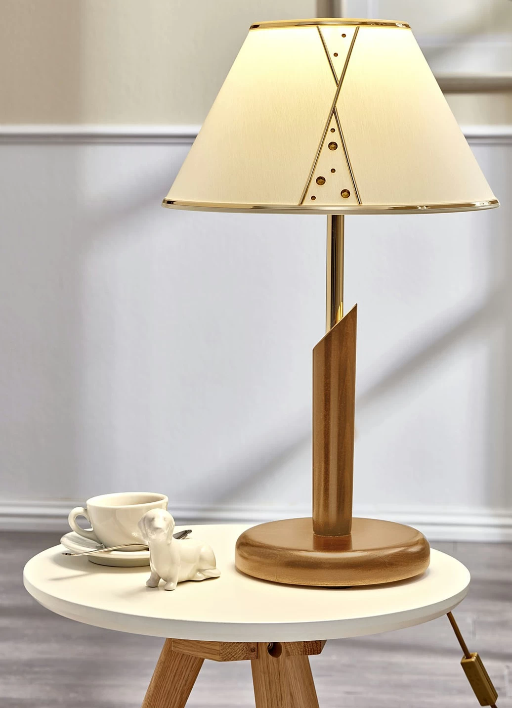 Elegante Leuchten aus Buchenholz, mit bedienerfreundlichem Mittelschalter sowie Glitzersteinen am Stoffschirm. Sie geben ein angenehm warmes Licht und sind Blickfänge für jedes Wohnzimmer. Lieferung mit austauschbaren LED-Leuchtmitteln der Energieeffizienzklasse G. 230 Volt. Maße: B31xH49xT31 cm