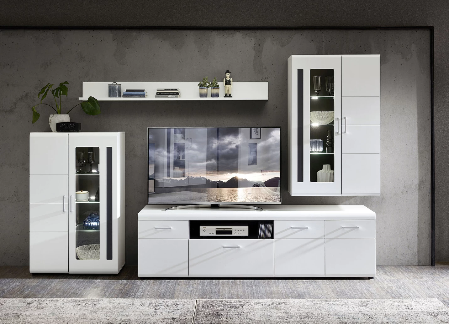 Trendstarke Wohnwand mit LED-Beleuchtung in Weiss-Graphit.