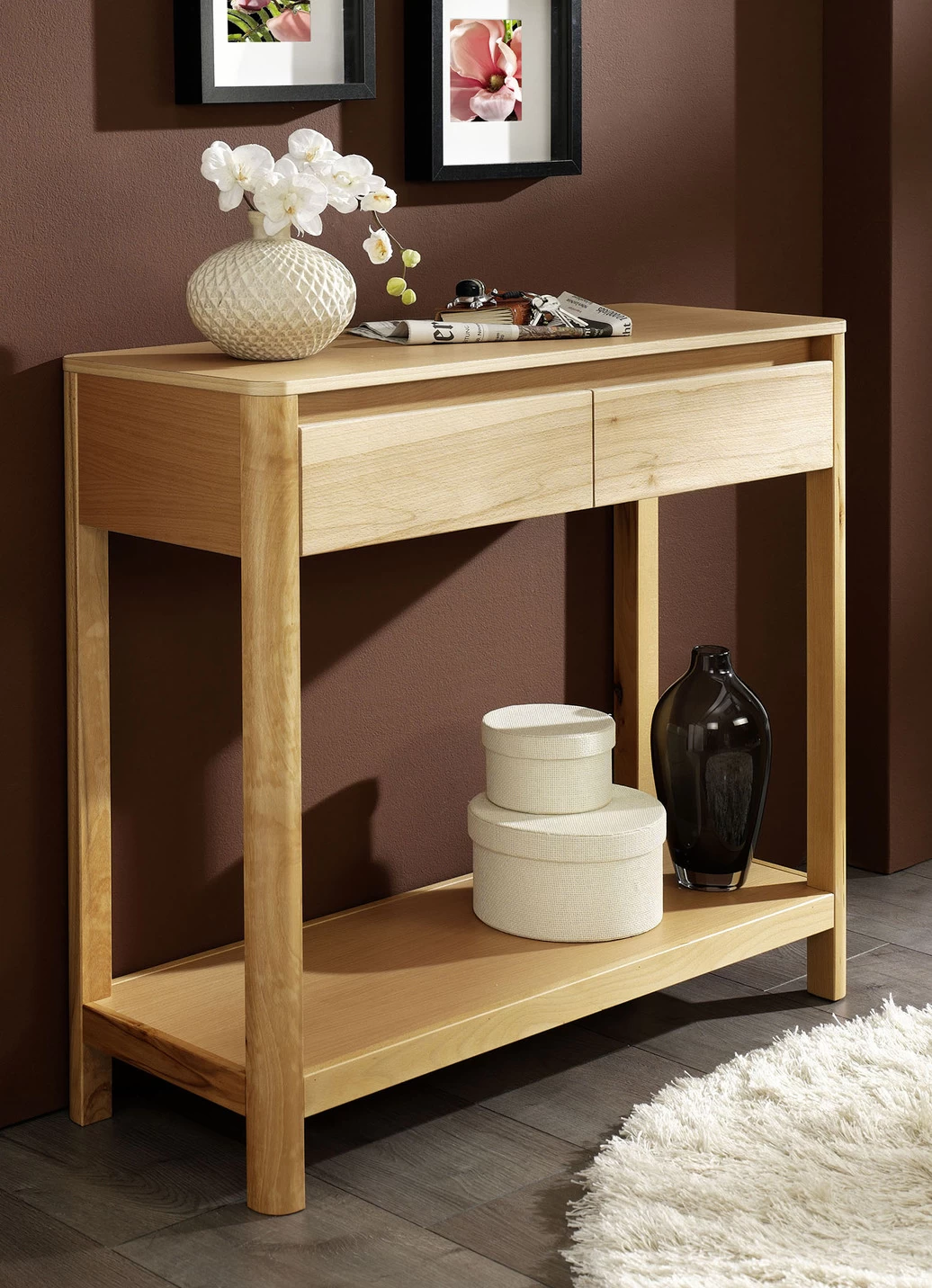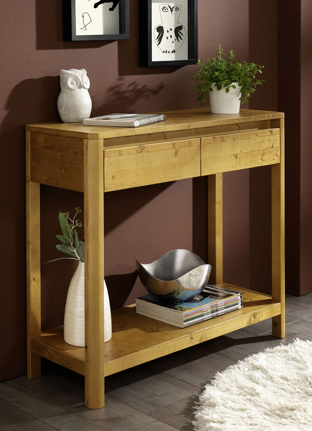 Besonders kombinierfreundlicher, hochwertiger Konsolentisch mit gerundeten Ecken und Kanten, der mit seinem natürlichen Charme zu begeistern weiß. Jeweils in geölter Ausführung aus teilmassiver Kernbuche oder massiver Fichte gefertigt. Mit 1 Schublade in 2er-Optik sowie 1 Ablage unten. Maße: B90xH78xT33 cm. Die Lieferung erfolgt aufgebaut