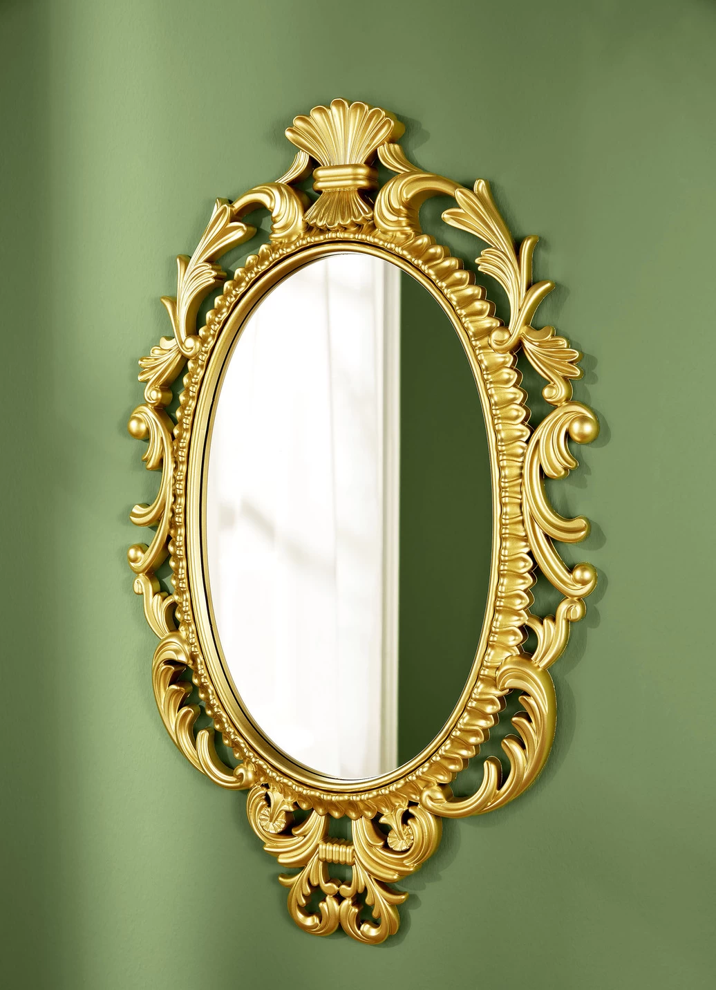 Glamour und Klasse – das verspricht der hinreißende Wandspiegel. Durch den extravaganten, opulenten Rahmen aus goldfarbenem Kunststoff zieht er alle Blicke auf sich und setzt dabei einen dekorativen Akzent in Ihrem Zuhause. Maße: B44,5xH73xT3,5 cm.