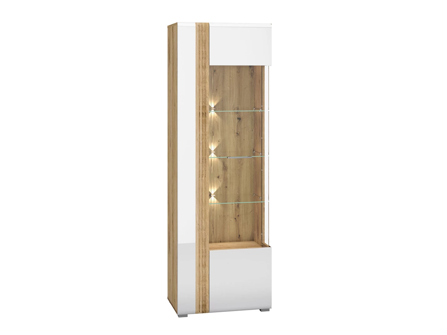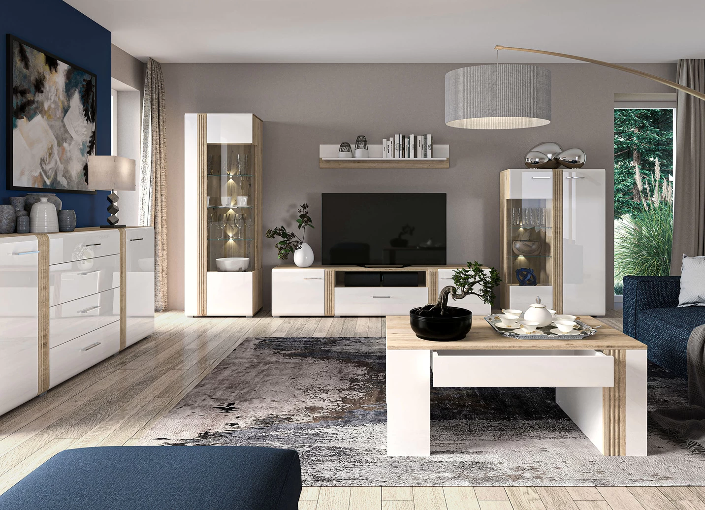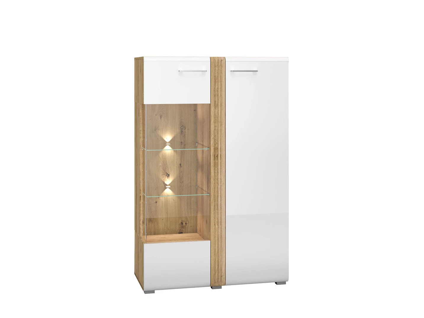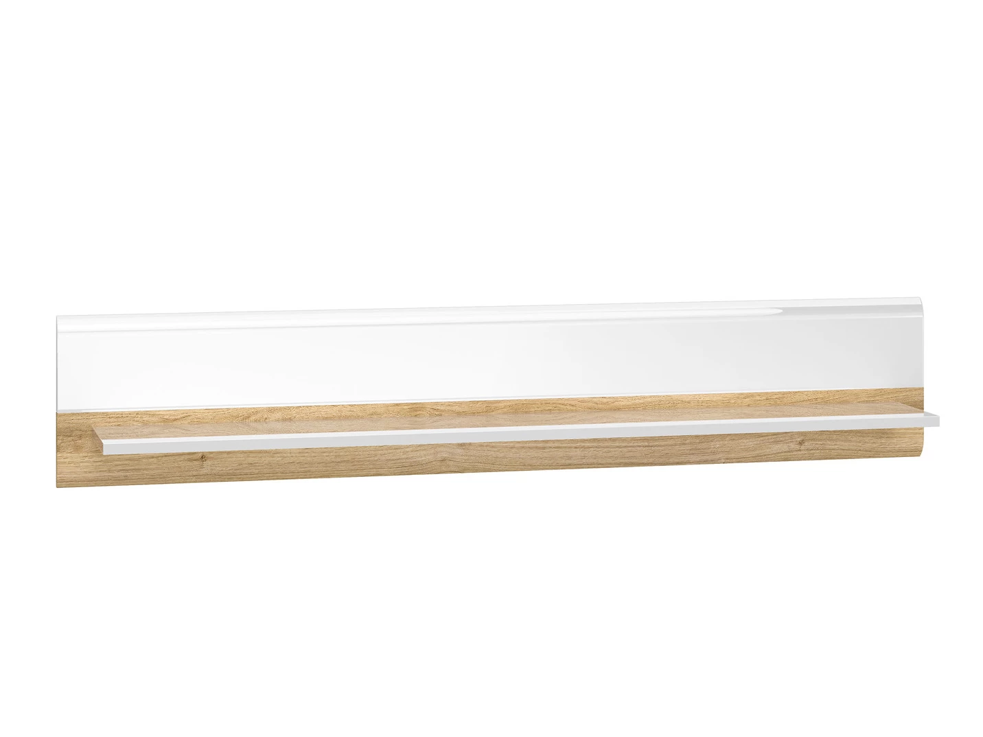 Wohnwand mit MDF-Fronten in Weiß Hochglanz, Korpus und Einfassungen in Eiche. Mit Metallgriffen. Schubladen auf Metallführungsschienen. Türen mit Softclose. Mit LED-Beleuchtung. Wahlweise mit Aufbau-Service durch geschultes Personal oder mit Aufbau-Anleitung erhältlich.
