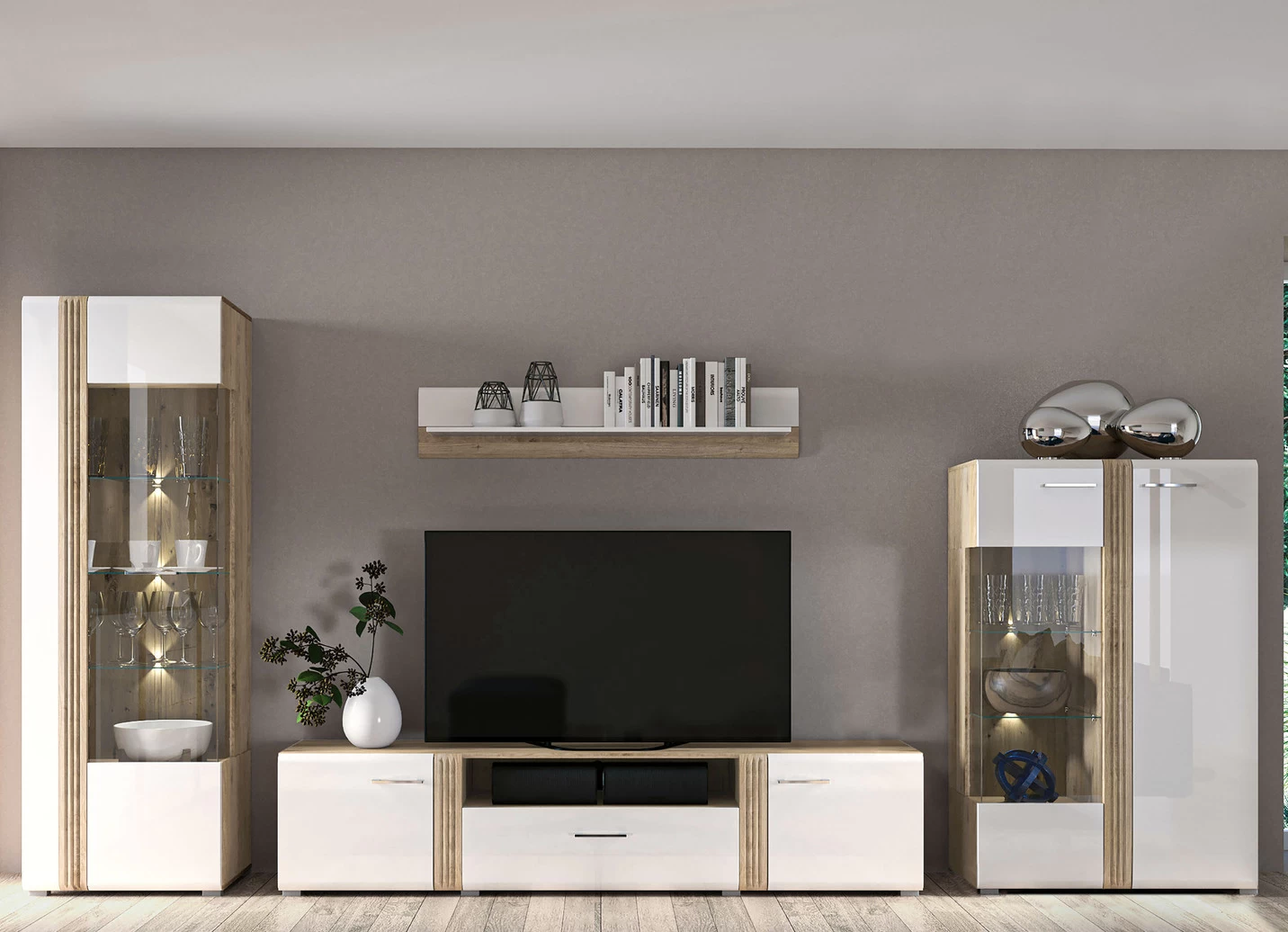 Wohnwand mit LED-Beleuchtung ohne Aufbauservice und in Weiss-Eiche.